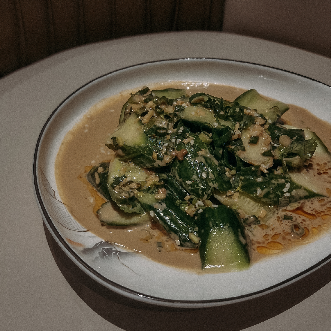 Crisp cucumber with creamy tahini dressing and a drizzle of mala oil