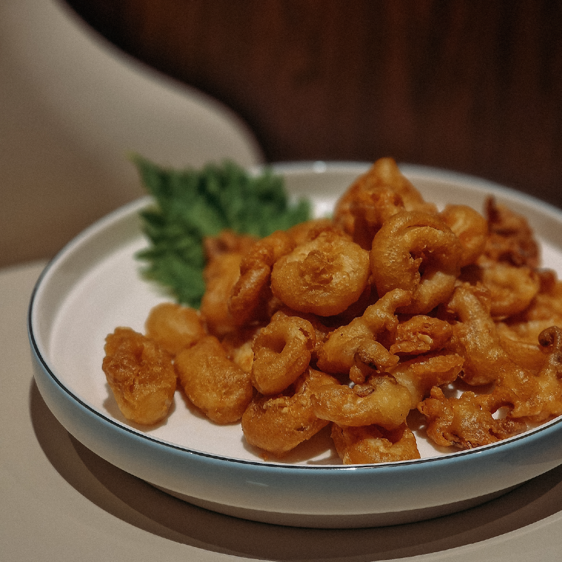 Lightly battered and fried to a crisp, tossed in a sweet and spicy glaze